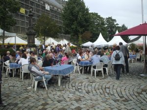 Überaus angenehm überrascht hat mich eine offensichtlich typische Berliner Kneipe: die Joseph-Roth-Diele in der Potsdamer Straße / Ecke Lützowstraße. Das es so etwas noch gibt: eine Kneipe, Bistro, Cafe mit Kaffeehausatmospäre. Joseph Roth, 1939 verstorbener Schriftsteller ist auf Bildern, Büchern und Kunstwerken allgegenwärtig. Es gibt Bier aus Tonkrügen, Buletten wie früher bei Heini („Ballermänner“) und Weißwein vom Kaiserstuhl. Der Laden hat Klasse, so etwas kennt man hier leider nicht mehr und genießt es um so mehr. Und dabei hat es nicht einmal einen touristischen Anstrich. Einfach toll wie auch folgendes Zitat: