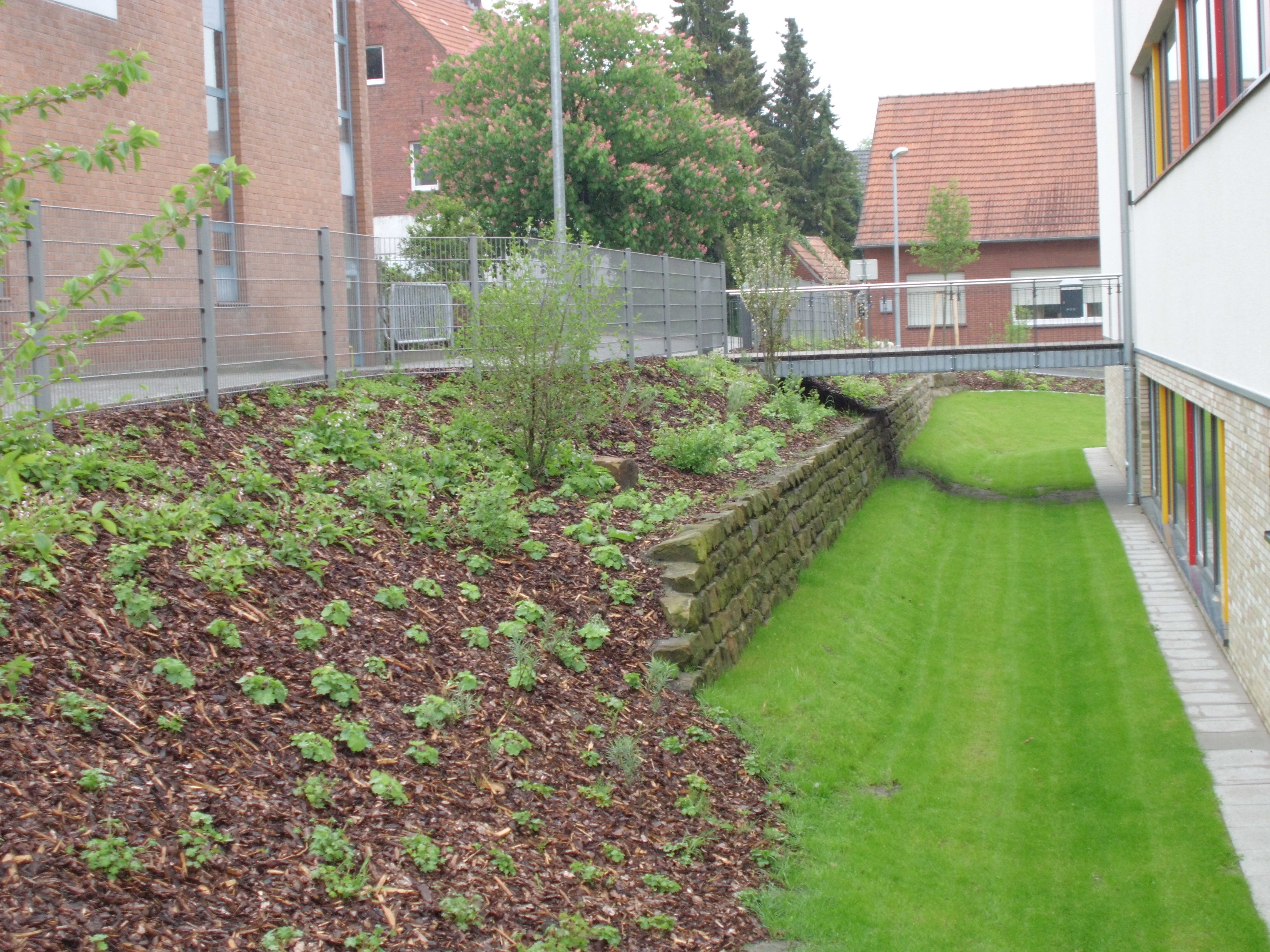 Schon ein Blick auf die Außenflächen mit den sensationell vielfältigen Spiel- und Aufenthaltsflächen (nur Ausschnitte auf Foto 1), in den Hang hineingebaut und mit überzeugenden Lösungen im Detail (Foto 2) begeistert: