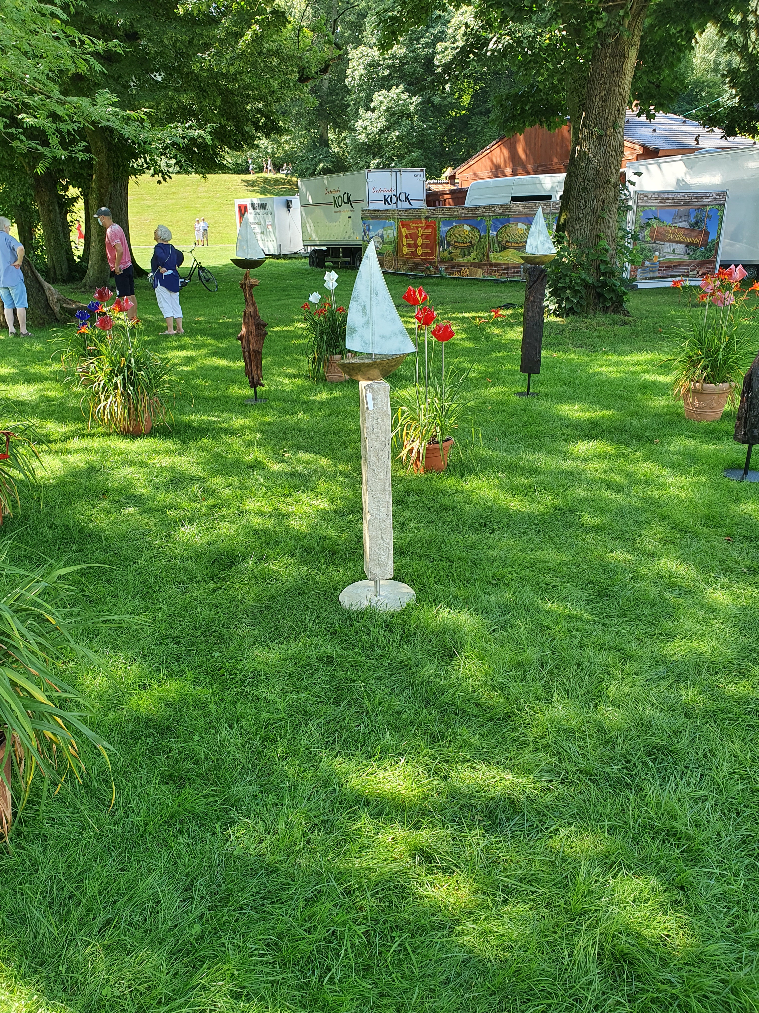 „Die 21. Auflage des Kunstmarktes findet zum zweiten Mal im Schlosspark statt. Das Veranstaltungsareal liegt direkt unterhalb der Burg Bentheim und bietet den Ausstellern großzügige Veranstaltungsflächen. Mächtige Parkbäume spenden den Besuchern bei Bedarf Schatten, umrahmt von klangvoller Pop- und Jazzmusik präsentieren die Künstler ihre Exponate“, lesen wir im Flyer der Tourisinformation für den diesjährigen Kunstmarkt.