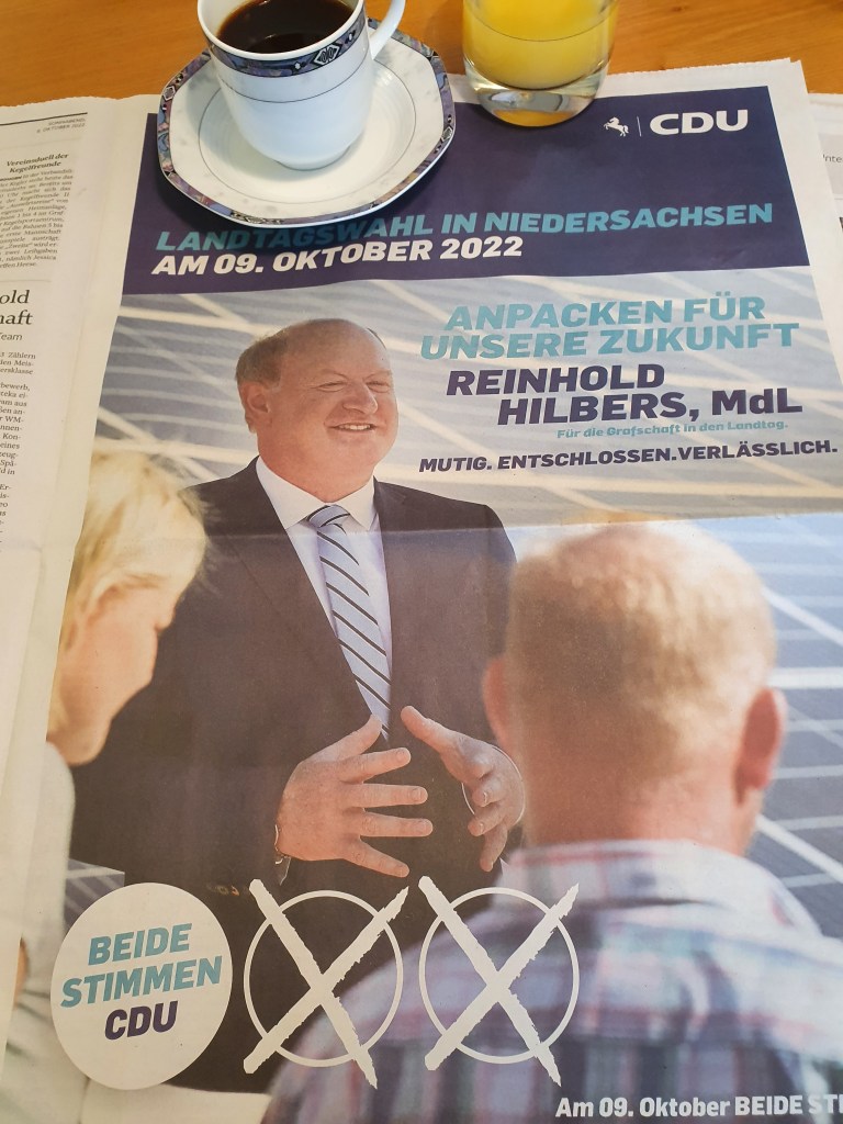 Heute wird der Leser (ich verzichte heute mal aufs Gendern) des Lokalteils allerdings etwas klüger, denn bereits beim Durchblättern springen die Anzeigen der CDU ins Auge. Ganzseitig wirbt Reinhold Hilbers um beide Stimmen für die CDU und auf den Folgeseiten geht es in etwas kleinerem Format mit weiteren teuer bezahlten Anzeigen so weiter. Parteiwerbung vor der Wahl ist sicher eine gute Sache und an platte Slogans sind wir gewöhnt. Auffällig ist heute allerdings, dass höchstens noch die FDP für ihre Verhältnisse bescheiden mit Anzeigen um die Wählergunst in der Lokalzeitung wirbt. Eine Schlussfolgerung liegt auf der Hand. In der CDU herrscht