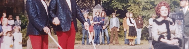 Und hier ein kleiner Rückblick in den Juni 1974, denn seinerzeit wurde „Der Besuch der Alten Dame“ erstmals auf der Bentheimer Bühne gespielt. Regie führte Wilhelm Michael Mund. Nach meiner Erinnerung passte er einige Details dem damaligen Zeitgeist an. Der Vergleich der beiden Aufnahmen zeigt, dass es dem Kleidungsstil der siebziger Jahre entsprechend wesentlich farbenfroher zuging. Er engagierte auch die Volkstanzgruppe der Landjugend Gildehaus und die Szenen mit der Güllener Bürgerschaft wirkten auch dadurch enorm authentisch. Vor der Generalprobe kam er auf uns Jugendliche zu und erkundigte sich nach unseren Mopeds, die er doch gerne einbauen würde. Gesagt, getan: ab sofort kanatterten wir in einer großen Volksszene mit unseren Mofas und Mopeds über die Brücke auf die Bühne. Unvergessen auch seine energische Regieanweisung an uns junge Männer, mehr Spannung in den Köper zu legen. So sind wir im Hintergrund ohne Mopeds, aber mit ausreichend Körperspannung zu erkennen: