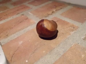 eine Kastanie (hier ein Duplikat), braun, glänzend und ein Erinnerungsstück an einen Herbstspaziergang auf dem Gildehauser Mühlenberg. Hätte dieses Geschoss den Weg auf das Spielfeld gefunden…kaum auszudenken…da hätte kein Aspirin geholfen (um noch ein Klischee zu bedienen).